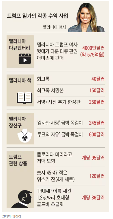 미국 대통령 선거에서 승리한 도널드 트럼프와 그의 가족이 대통령직을 활용해 막대한 수익을 올리고 있다는 논란이 제기되었다. 트럼프 일가는 후원금으로 8천만 달러를 모았으며, 멜라니아 여사는 다큐멘터리 판권을 아마존에 4천만 달러에 판매했다. 또한, 트럼프는 자신의 이름을 딴 가상화폐 ‘$TRUMP’를 발행했으며, 해당 코인은 폭등과 폭락을 반복하며 투자자들에게 약 20억 달러의 손실을 초래했다. 보고서에 따르면 트럼프 일가는 10억 개 중 8억 개를 보유하고 있어 막대한 수익을 거둘 가능성이 있다. 이외에도 트럼프 스토어에서 각종 기념품을 판매하며 수익을 창출하고 있다. 이 같은 행보는 공적 지위를 이용한 부당한 이익 창출이라는 비판을 받고 있으며, 이해 상충 문제도 제기되고 있다.